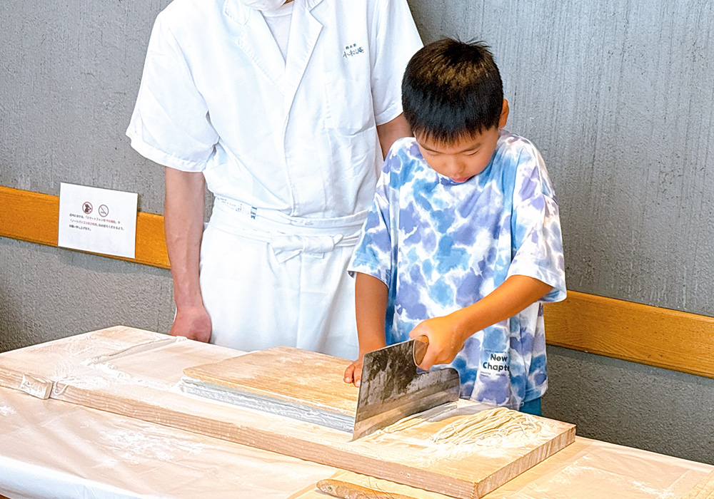小さいお子様にとっては大きな包丁はとても重たくなかなか大変です。最後は自分たちで切ったお蕎麦を試食しました。ちょっと太めでも自分で切ったお蕎麦だと一層美味しく感じます。夏休みの楽しい思い出になれたら幸いです。